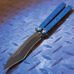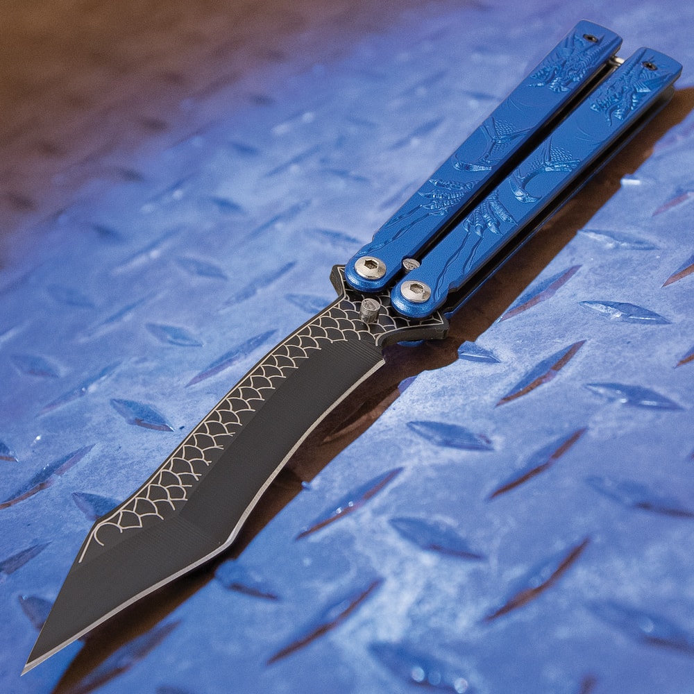 The Blue Dragon Butterfly Knife delivers smooth performance with a touch of bold design. Its 4 1/4" stainless steel clip point blade has a black matte finish and etched dragon-scale detailing along the spine for added character. The dual flippers make opening fast and fluid, giving you full control every time you handle it. A molded steel handle with a metallic blue finish and detailed 3D dragon artwork brings both grip and style to the design. Reinforced with stainless steel pins and a dependable latch lock, this 9 1/4" butterfly knife is durable, secure, and comfortable to practice or carry.
