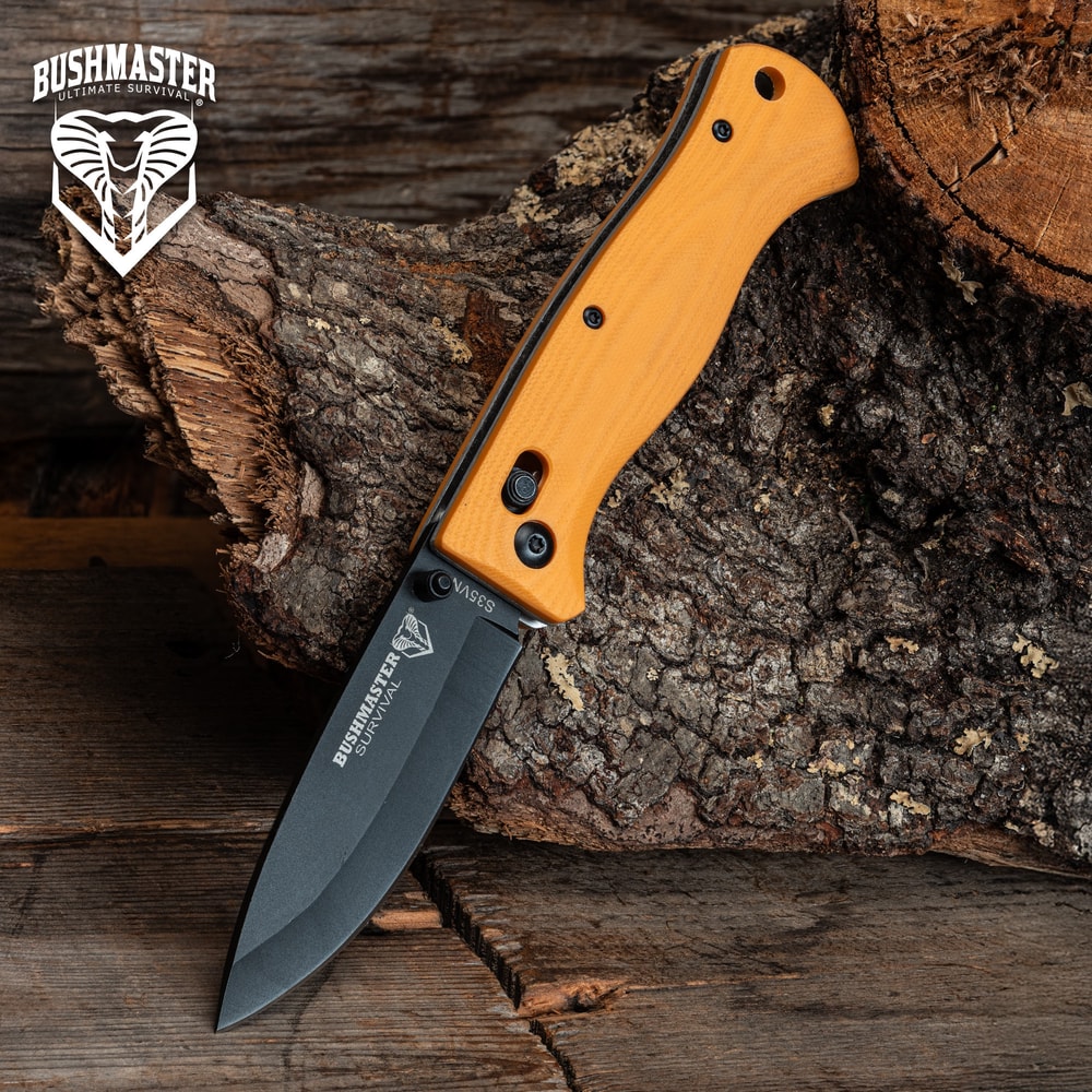 The Bushmaster Explorer G10 Pocket Knife is built for durability, control, and dependable use across demanding conditions. Its handle scales are crafted from G10, a material chosen for its strength, rigidity, and resistance to wear. The handle is finished in orange, offering increased visibility while maintaining the same durable construction. Paired with a 3 3/8" S35VN steel blade finished with a black titanium coating, the knife delivers consistent cutting performance in a compact folding profile. Measuring 7 3/4" overall, it offers a balanced feel that supports confident handling during everyday and outdoor tasks. A ball bearing pivot system allows for smooth, controlled blade deployment when needed. The liner lock keeps the blade firmly positioned once opened, supporting secure, controlled use. When closed, the knife measures 4 3/8", making it easy to carry without unnecessary bulk. A sturdy metal pocket clip keeps the knife positioned securely and ready for quick access throughout the day.