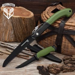 The Bushmaster Hunter Knife and Folding Saw Set is an essential companion for hunting, camping, and survival adventures. The fixed blade knife features a 4" finely honed 1065 carbon steel blade, designed for precision cutting and rugged durability. Its black-coated finish enhances resilience, while the heavily ridged TPU handle ensures a secure grip, even in wet conditions. At 8 1/2" overall, this compact yet powerful knife comes with a TPU belt sheath, making it easy to carry in the field. The folding saw, built for heavy-duty cutting tasks, boasts a 7 1/4" sharp 65Mn steel blade with a black-coated finish for added strength. Measuring 16" when fully extended, the saw locks securely in place, ensuring safety and stability during use. Its ridged TPU and TPR handle matches the knife’s slip-resistant grip, providing comfort and control. Designed for reliability in demanding conditions, this versatile set is an invaluable addition to your outdoor gear.