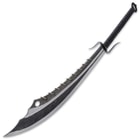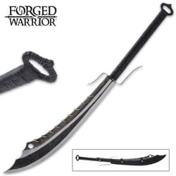 The Forged Warrior Chinese Nine Ring Broadsword stands out as a dramatic interpretation of a time-tested Chinese weapon design. Its dadao-style blade is crafted from two-toned stainless steel and finished with a scorched look that gives it a timeworn, commanding presence. Nine metal rings are threaded loosely along the spine, adding audible sound and extra weight that enhance its imposing presence during motion. Measuring 25 1/2 inches, the blade balances visual weight with controlled reach. The two-handed handle is wrapped in wax cord to provide a secure and comfortable grip during use or display. A distinctive guard transitions cleanly into an open-ring pommel that tapers to a pointed end, reinforcing the sword’s bold profile. At 42 1/2 inches overall, the broadsword has commanding size without feeling unwieldy. It comes with a matching scabbard equipped with an adjustable shoulder strap for convenient carry and storage.