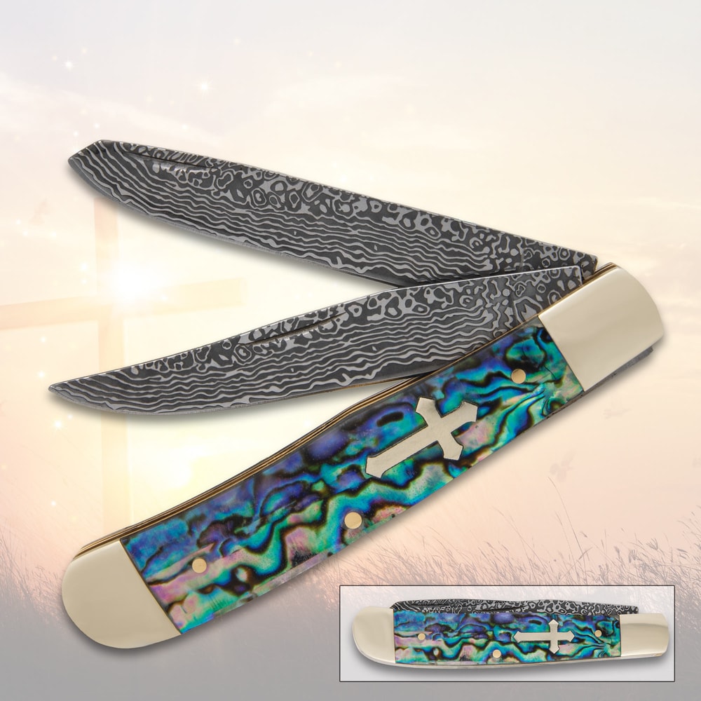 The Christian Faux Damascus Pocket Knife brings traditional styling together with thoughtful detail in a compact, everyday folding design. Measuring 7 1/4" overall, it offers a comfortable size that fits naturally in hand without feeling bulky. The knife features two 3 1/4" blades with a faux Damascus pattern, giving it a distinctive layered look that stands out visually. A clip point blade and a spey blade provide versatile options for a range of everyday tasks. The abalone handle adds natural color and visual depth, accented by a cross inlay that reflects a quiet expression of faith. Both blades open smoothly and store neatly within the handle when closed. The balanced proportions make the knife easy to carry while still feeling substantial during use. With its combination of symbolic detail and practical features, this pocket knife serves as both a functional tool and a personal statement piece.