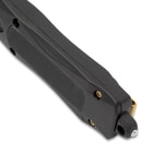 The Damascus Gold Dagger: The Premium Automatic OTF Knife is a sleek and versatile tool designed for enthusiasts and professionals alike. This knife has a total length of 9 ¼” and 5 ½” closed, making it the perfect companion for everyday carry, outdoor adventures, or tactical situations. The knife features a striking gold damascus-etched dagger blade that not only looks stunning but also provides impressive cutting capabilities. Constructed with a black zinc alloy handle complemented by G10 inserts, this knife is built to withstand tough use and maintain its sleek appearance. For added protection and portability, this knife comes with a nylon pouch, ensuring your investment stays safe during transport.