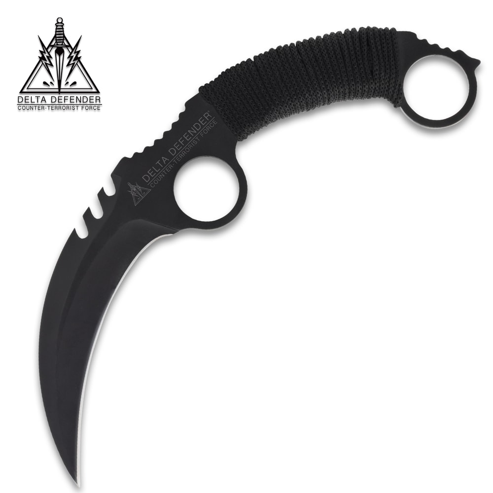 The Delta Defender Shadow Talon Karambit is built for performance and dependability with a 4" black stainless steel blade in a full-tang design. Its curved profile and sharp edge deliver the control and cutting power that define the karambit style. Measuring 9" overall, it strikes the right balance between size and handling for everyday or outdoor use. A black cord-wrapped handle ensures a secure grip, while the included nylon sheath offers safe carry and quick access. Whether added to your gear or collection, this karambit delivers a sleek, practical design backed by durable materials.