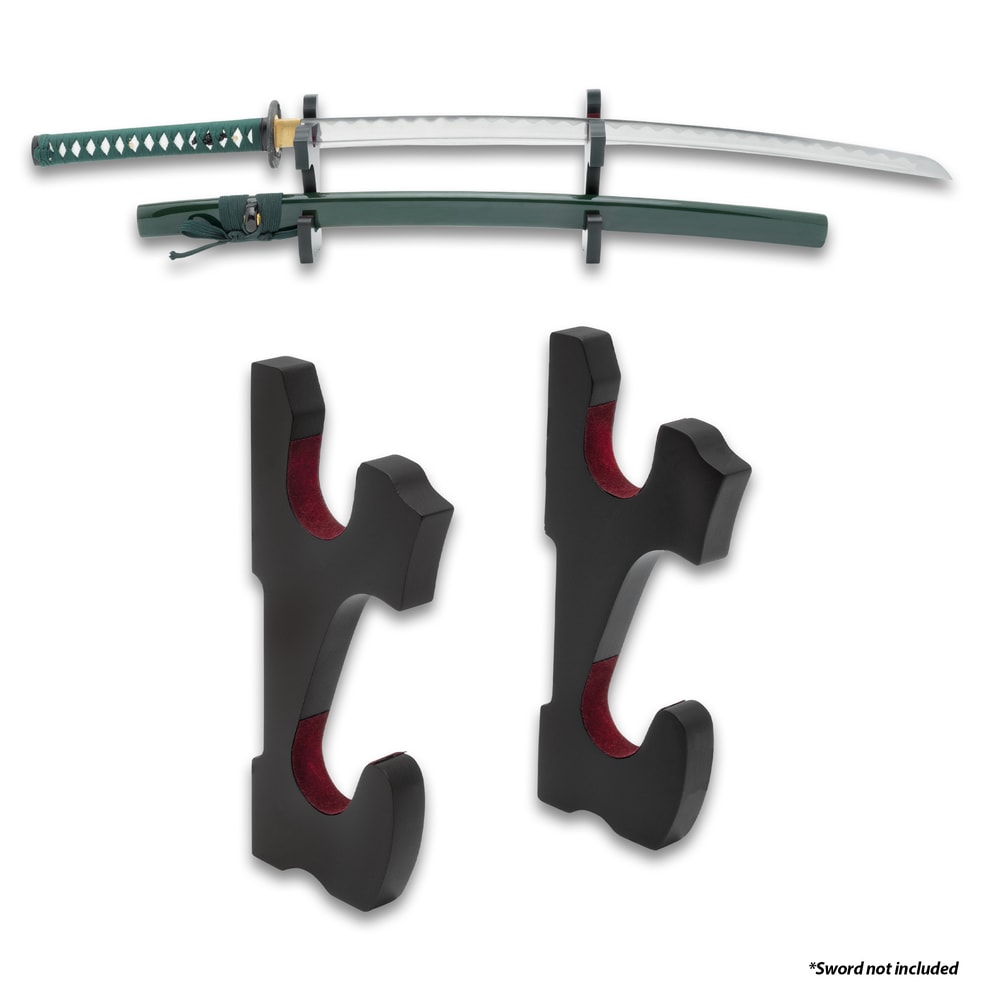 The Double Sword Wall Mount will guarantee that two of your valuable katanas are securely displayed and easily accessible in your home or office. You won't have to worry about them getting damaged when they're cradled in the red felt covered racks. The 7"x 3 1/2" wall display is constructed of premium, matte black wood and the wall mounting hardware is included.