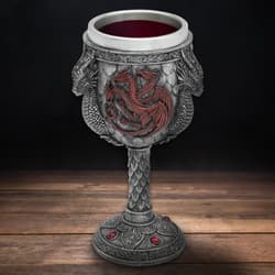 Fit for the King of Dragons, our Dragon Sculpted Goblet is ornately detailed. It looks like it was worked out of pewter not cast resin, which speaks to its high quality. The stem and bowl of the goblet are dragon-scaled and the bottom features faux rubies. Three equidistance dragon heads with long necks cradle the goblet and in between them are red three-headed dragon medallions. An integrated stainless steel liner will keep your beverage of choice cold.