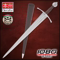 The Honshu Historic Forge 14th Century Double Fuller Sword is a masterful blend of historical accuracy and modern craftsmanship. Designed for collectors, reenactors, and martial arts practitioners, this sword replicates the classic 14th-century design with a 26 1/2" carbon steel blade featuring a double fuller for enhanced balance and weight distribution. The Rockwell Hardness HRC 47-52 rating ensures durability and performance, making it a reliable piece for both display and combat training. With a brown leather-wrapped handle, this sword provides a secure grip and excellent maneuverability. The circular pommel and oversized crossguard not only enhance its authentic medieval look but also provide added hand protection. The double-edged blade allows for versatile combat techniques, making this an exceptional choice for enthusiasts of historical weaponry.
