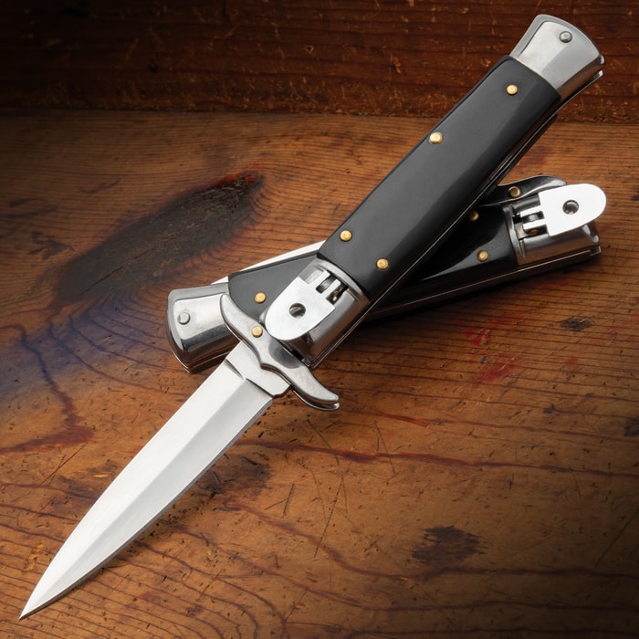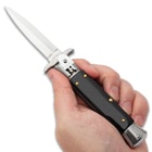 Unlock the epitome of convenience and precision with our Lever Lock Automatic Knife. Crafted with excellence, this knife boasts a compact design measuring 4 1/2" when closed and extends to a formidable 8 1/4" overall length. Engineered with a robust safety lock mechanism, it ensures secure handling and storage. Featuring a razor-sharp 3 1/4" blade forged from high-quality 440C stainless steel, this knife guarantees exceptional cutting performance, making it your trusted companion for various tasks. The Lever Lock Automatic Knife boasts an ingenious hand guard that seamlessly opens and closes with the blade, ensuring unparalleled safety and convenience. This knife is equipped with an integrated hand guard that cleverly opens and closes synchronously with the blade, enhancing user safety and ease of use. The sleek wooden black handle not only adds sophistication but also provides a comfortable grip for extended use. Arriving with a black nylon pouch, this automatic knife is not just a tool but a statement of style and functionality.