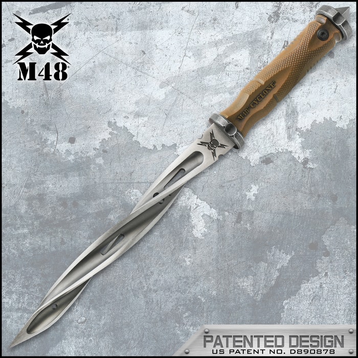 The M48 Battle Scarred Tan Cyclone is a rugged, battle-ready blade that merges tactical power with a one-of-a-kind design. Its 8” cast stainless steel blade features a weathered stonewashed finish and three spiraling edges that taper to a piercing point. More than just a visual statement, this knife is engineered for serious cutting and puncturing performance. The handle is crafted from glass-fiber-reinforced nylon with a tan finish, offering a slip-free grip that’s both durable and dependable. A stainless steel pommel with impact capability and a matching guard complete the build. The Cyclone comes housed in a custom Vortec sheath for reliable, secure carry in any setting.