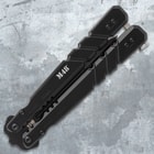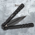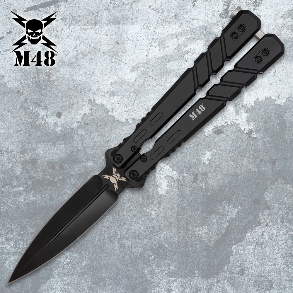 The M48 Butterfly Knife is more than just a flipping knife for showing-off to your friends. It's built battle-ready with a razor-sharp blade that will make quick work of cutting and slicing tasks out in the field. The deeply ridged handles are incredibly tough and grippy and the handle latch is bead-blasted stainless steel. The blade fits securely between the handles to give the tactical butterfly knife a closed length that fits easily in your pocket or your gear.