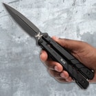 - The 4 3/8", black-coated 7Cr17 stainless steel blade has a blood groove, and it rotates smoothly around the torx screws