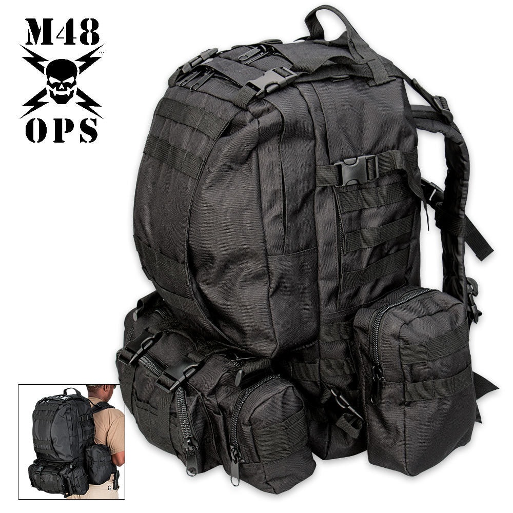 Designed for tactical missions and rugged outdoor use, the M48 OPS Gear Assault Pack delivers a powerful combination of durability, functionality, and adaptability. Built from heavy-duty nylon, this pack features a spacious main compartment and a secondary compartment, both outfitted with internal pockets for efficient organization. Detachable side pouches and a front utility pouch allow you to tailor your loadout to fit your gear and mission. The pack is outfitted with MOLLE webbing for modular expansion and internal carabiner clips for quick-access tools. Padded shoulder straps and an adjustable waist strap provide a secure, comfortable fit, while the cushioned back panel adds support during long treks. Whether you're headed out for an expedition or gearing up for tactical operations, this assault pack has your back.