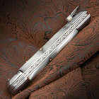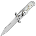 With its milky, white pearlized handle, the Marble Stiletto Automatic Knife was inspired by the iconic Italian stiletto that were brought to the US by soldiers after W.W.II. The handle is crafted of marble resin scales that are complemented by the polished stainless steel bolsters. The stiletto blade is razor-sharp with a penetrating point and just a push of the lever release deploys it smoothly. Carry the Marble Stiletto Automatic Knife conveniently in its tough belt pouch.