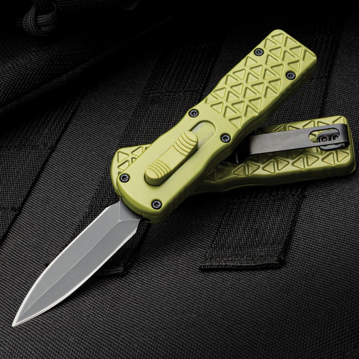 The ShadowMaster Mini OTF Knife is a compact tactical tool built for fast response and dependable carry. Its 2" 440 stainless steel blade has a low-profile black finish and deploys instantly with out-the-front action for one-handed access. Sized for concealment and readiness, this knife delivers practical performance in a small package. The handle provides a secure grip and includes a stout pocket clip for reliable carry and quick retrieval. Available in vibrant pink, blue, black, or green handle options, this lightweight knife is engineered for steady operation and suited to everyday carry where quick access and compact size are essential.