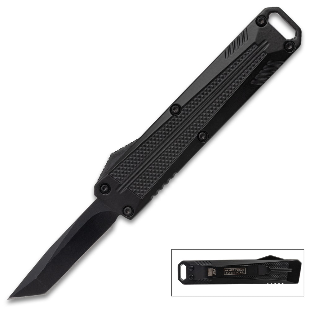 Built for discreet carry and practical performance, the Nightfall Tanto OTF brings a compact, hard-working edge to daily carry. The 2" 440 stainless tanto blade offers a tough, reinforced edge built for reliability, while the OTF deployment gives instant, one-handed access when speed matters. The textured black handle fits the hand and includes a lanyard hole for alternate carry setups. Measuring 5 1/2" overall, the Nightfall Tanto OTF balances concealment and usability. Small enough for pocket carry, solid enough for real work. A low-profile pocket clip secures the knife for fast retrieval, and the mechanism is tuned for repeatable, confident operation whenever you need it.