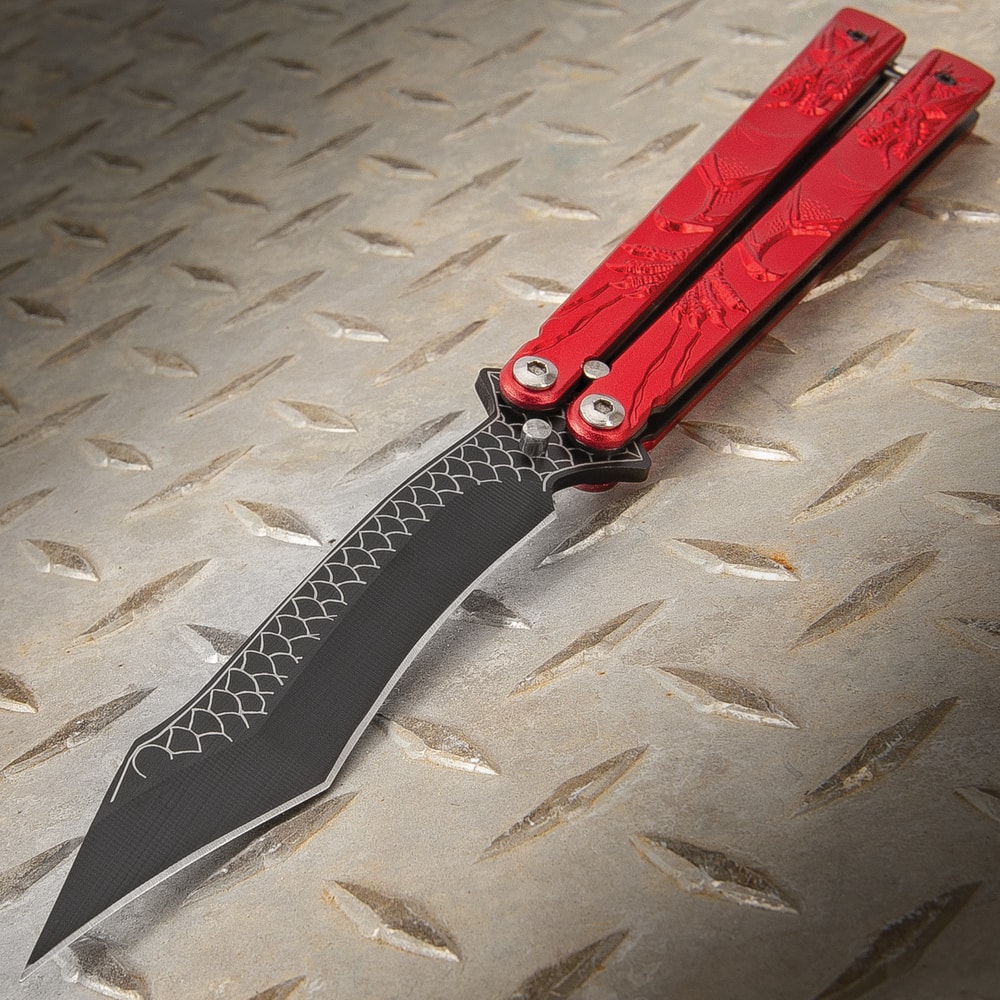 Red Dragon Butterfly Knife - Stainless Steel Blade, Molded Steel Handle, Latch Lock, Double Flippers - Length 9 1/4”