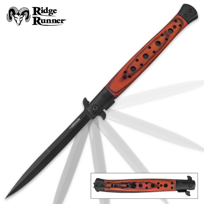 The Speed Demon Stiletto Knife from Ridge Runner is one of the largest stilettos you’ll see out on the market today. The slim, black stainless steel stiletto blade comes in at 6” and can be deployed lightning fast with the assisted opening mechanism. The brown wooden handle has decorative cutouts and features black steel bolsters and a pocket clip. No one will be able to ignore this magnificent pocket knife!