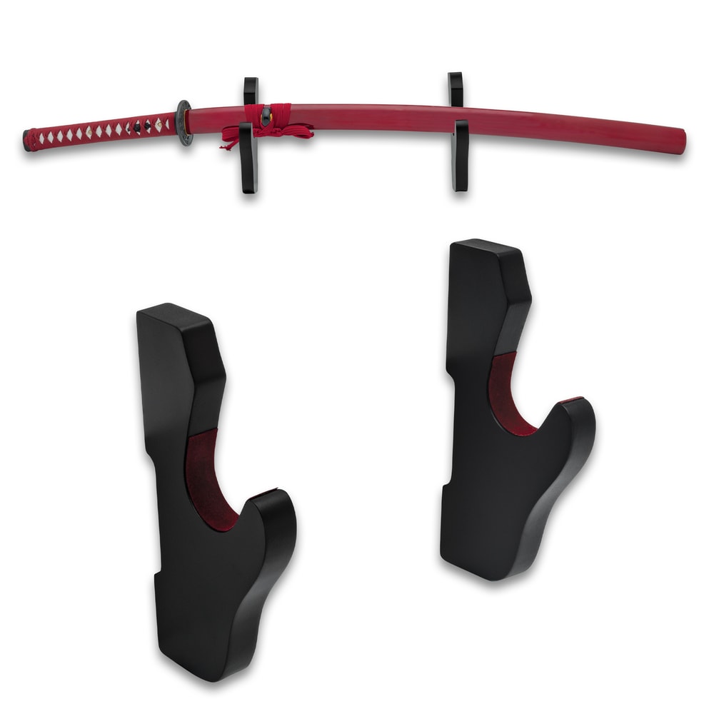 When you have invested in a valuable katana, part of that investment needs to be in its care, which means that it needs to be securely displayed where it can't be damaged. Our Single Sword Wall Mount is constructed of premium wood with a matte, black finish. The rack is padded with red felt so that the blade or scabbard won't be scratched and won't slide. The wall display's dimensions are 6"x 3" and the wall mounting hardware is included.