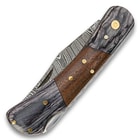 The Timber Wolf File Worked Damascus Pocket Knife delivers craftsmanship you can carry. Its 3” clip point blade is hand-forged from genuine Damascus steel, displaying unique layered patterns that make every knife one of a kind. Decorative file work along the spine adds a level of detail rarely seen in everyday carry blades, showcasing the care that went into its creation. The handle pairs warm walnut with black pakkawood scales for a striking and comfortable grip. At just 4” when closed, this pocket knife is compact enough for daily carry while offering enough visual character to earn a place in any display. Whether you're cutting, collecting, or both, this knife brings performance and style into perfect balance.