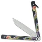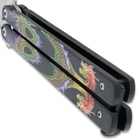 The Twin Dragons Purple And Gold Butterfly Knife was designed to catch the eye, smoothly rotating around its tang in a whirl of colors, giving an impressive flipping display. The razor-sharp, 4” stainless steel blade has a satin finish and can be quickly flipped open with either of its flippers. The black, aluminum handles have detailed artwork of two dragons back-to-back done in tones of gold, red, green and purple and the latch lock keeps it securely closed. The elegant, black butterfly knife is 5”, when closed, and 8 3/4” in overall length, making it perfect to hone your skills.