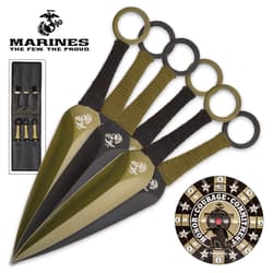 This USMC Throwing Knife Set with Paper Target is just what you need to get you started in the art of knife throwing. The razor sharp stainless steel throwers each measure 9" in length and have cord-wrapped handles for a secure grip. You'll get three tan knives and three black knives, which are perfectly balanced for an easy, accurate throw every time. The exclusive USMC themed paper target with custom, original artwork is perfect for long range throwing. A custom folding nylon carrying case is included.